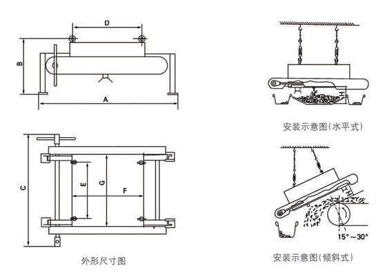 | 型号 | 适应带宽mm | 额定吊高mm | 磁场强度≥mT | 适应料厚≤mm | 重量kg | 悬挂尺寸 D*E mm | 外形尺寸 mm | 磁系尺寸 mm |